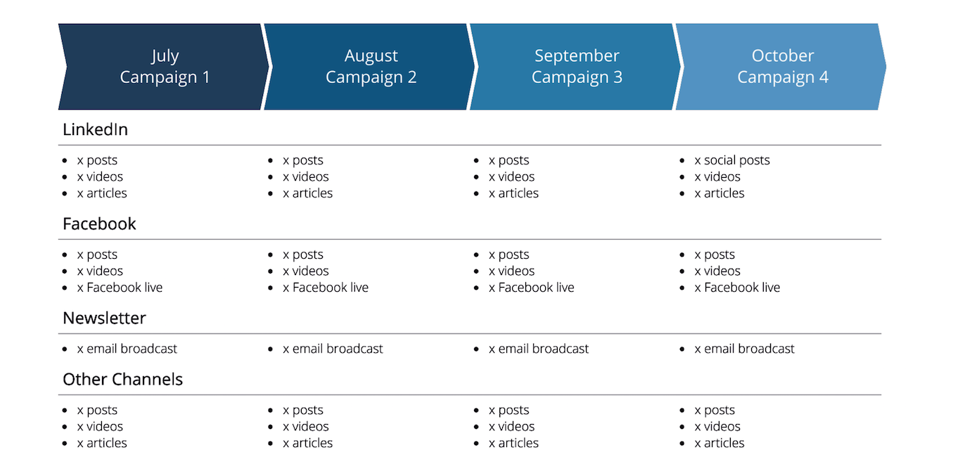 You’ll also need to establish who your contributors are: how will you disseminate your plan and collaborate with them on it ongoing? This is important because you can’t do it all yourself – you need to divide it up and get your colleagues to work together, otherwise your job will quickly become 24/7!